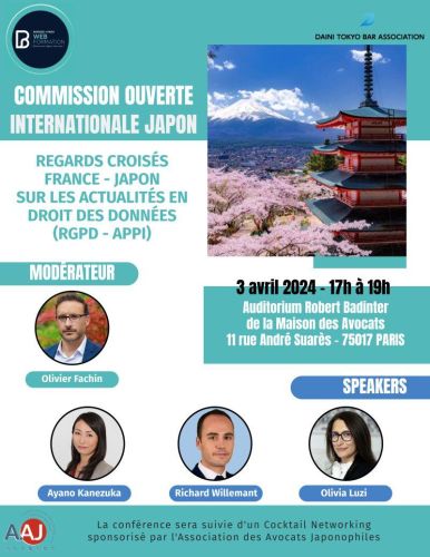 Pour marquer cette nouvelle synergie, la Commission a organisé une première conférence (réservée aux avocats) le 3 avril 2024 en présentiel, sur le thème du RGPD. Elle a été suivie d’un cocktail networking sponsorisé par l'Association des Avocats Japonophiles - AAJ (日仏弁護士協会).